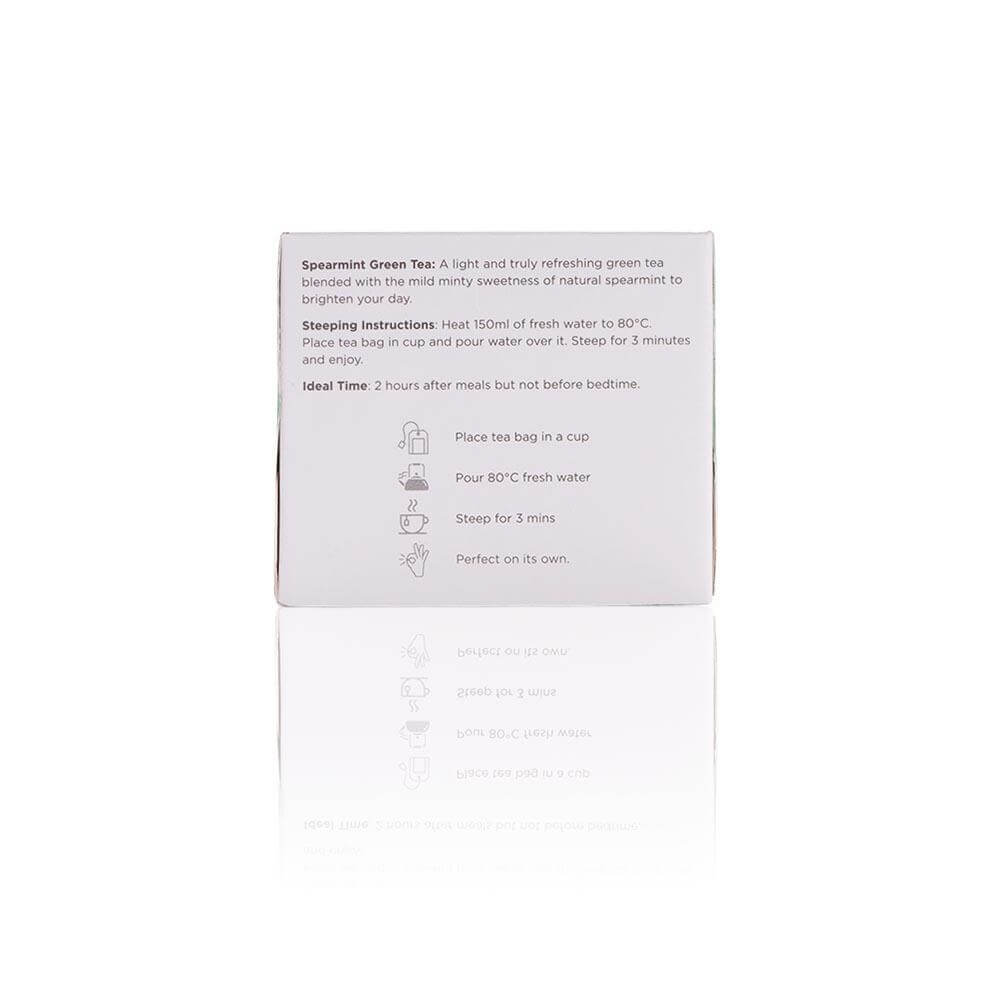 Perfectly balanced Spearmint and Green Tea with a cooling and refreshing minty sweetness. An ideal tea for reducing stress and improving mental alertness.